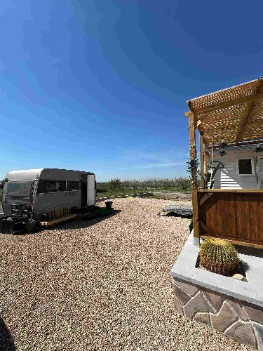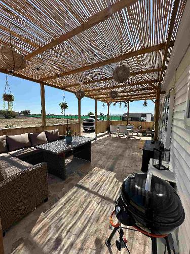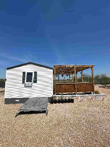 W pent møblert campingvogn for gjester on plassert ved siden av mobilboligen.