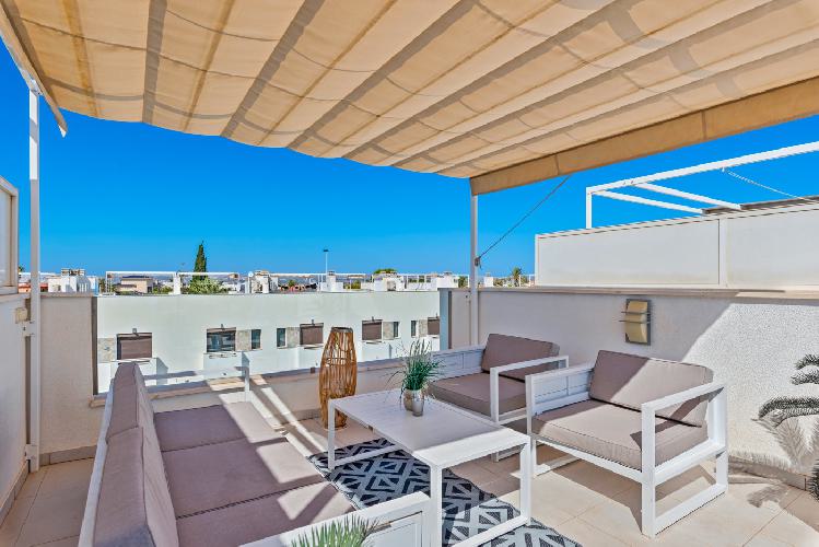 Dette nye rekkehuset ble bygget i 2019 og kan skilte med en av de beste beliggenhetene i Torrevieja, og legemliggjør moderne komfort og luksus, og det venter bare på deg.